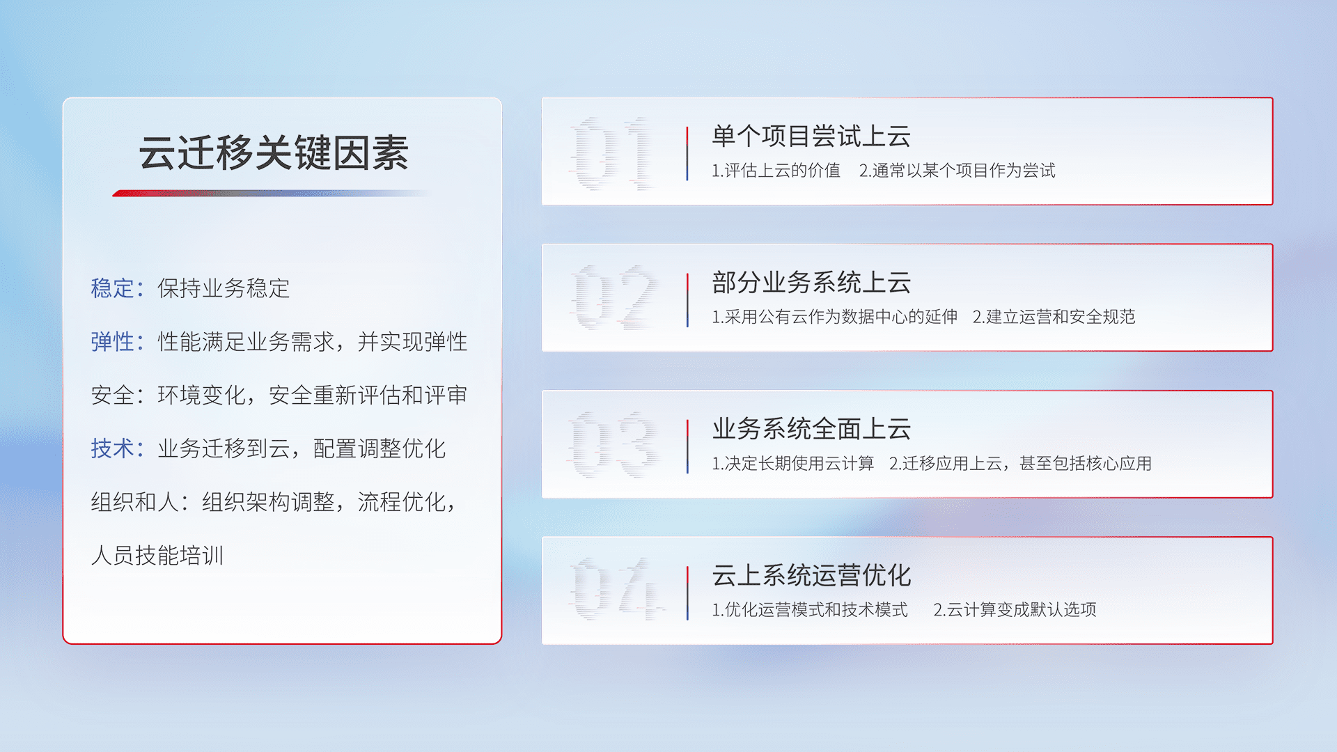 结合实际业务,,从规划设计、、云平台选型、、云原生改造、、、数据迁移、、集成交付,,,,迁移全过程为客户识别最佳上云路径,,做好风险识别管理,,,设计网络架构、、、身份权限、、、安全审计合规、、、操作审计、、、、日志审计、、监控告警策略、、、多站点容灾设计等,,,对云上基础设施进行整体规划,,,提升IT治理水平,,,以满足弹性、、、、高可用、、、、高性能的需求。。。