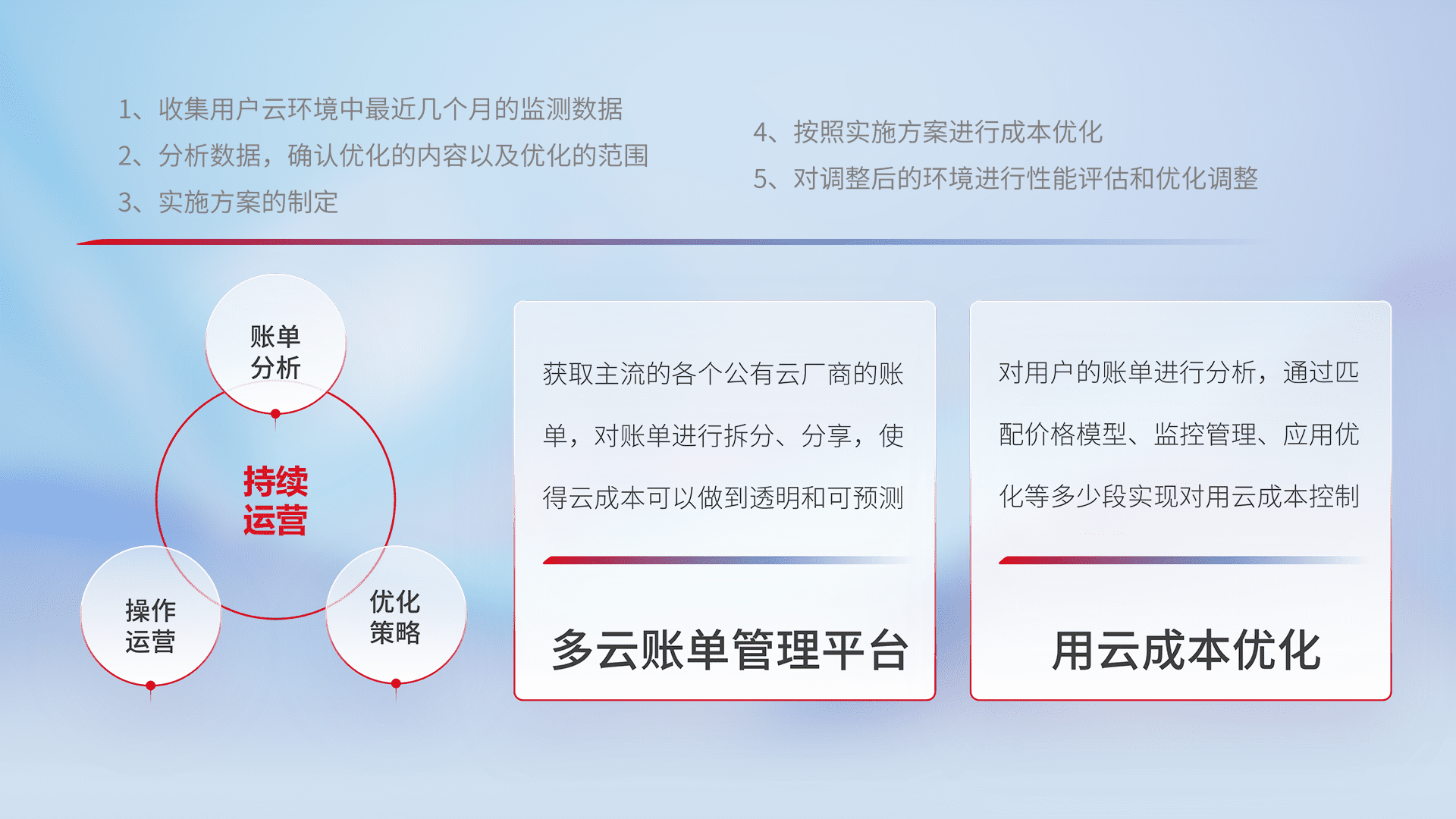 通过多云纳管,,以统一的资源数据模型把客户的云资源进行抽象和封装,,,进而实现对多云资源的统一操作,,,,保障云资源管理的可靠性、、、稳定性与可用性。。。。量身定制化运维内容,,,,配置、、开发运维、、补丁管理、、、、备份、、、、监控、、认证和访问管理、、审计和日常巡检等,,保障在用云过程中的可靠度,,,,稳定度以及高可用率。。